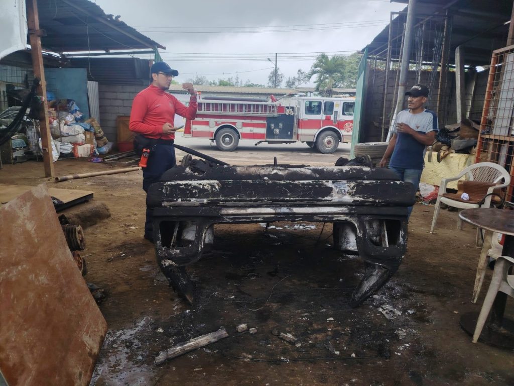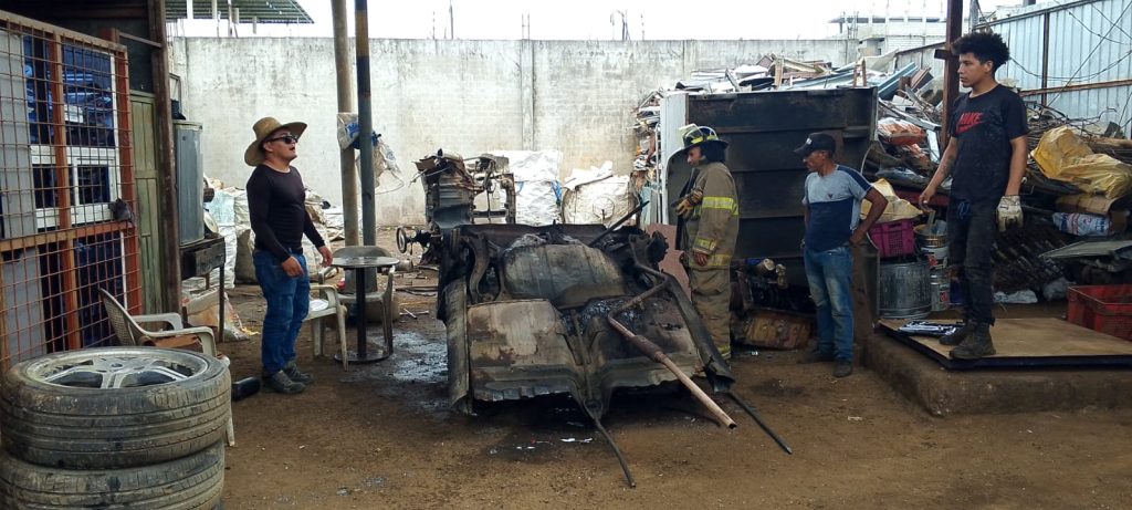 El día sábado, 08 de noviembre del 2025, se recibe un aviso de incendio en una recicladora, por la escuela Imbabura, Av. Joffre Lima y Los Cedros; por lo cual se despacha la unidad USR-4 al sitio; ya en el lugar se pudo evidenciar que la situacion estaba controlada por los mismos propietarios de la recicladora, a los cuales se les dió las debidas recomendaciones, ya que se encontraban haciendo trabajos de retirar un tanque de gasolina a un vehiculo en chatarra, por lo que estaban haciendo uso de una amoladora, la cual generó chispas y debido a los gases acumulados en el tanque de combustible, este realizó una deflagración, y posterior ignicion del tanque, el cual fue apagado con un extintor del local. No hubo daños materiales.